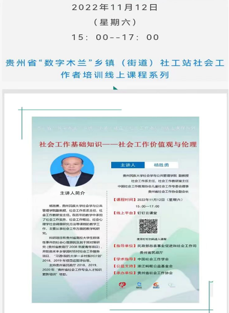 2022-11-14 2022年11月12日,探花直播 社会工作系系主任杨胜勇副教授受贵州省社会工作协会邀请,为贵州省“数字木兰”乡镇(街道)社工站社会工作者开展第五期线上培训。此次培训的主题是“社会工作基础知识——社会工作价值观与伦理”。杨胜勇老师采取理论知识+案例分享…