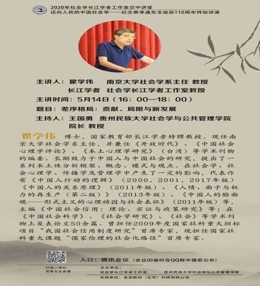 2020-05-21《差序格局:贡献、局限与新发展》纪念费孝通先生诞辰110周年特别讲演第二场讲座隆重开讲 2020年5月14日下午迎来了由社会学长江学者工作室和探花直播 社会学与公共管理学院共同举办的“2020年社会学长江学者工作室空中讲堂 迈向人民的中国社会学——纪念… -