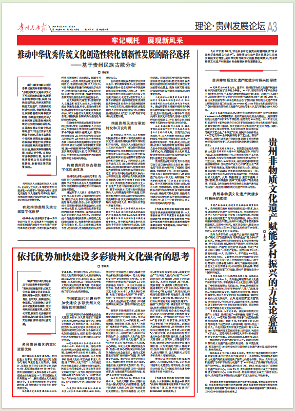 《贵州民族报》刊发探花直播 曹群勇教授文章《依托优势加快建设多彩贵州文化强省的思考》