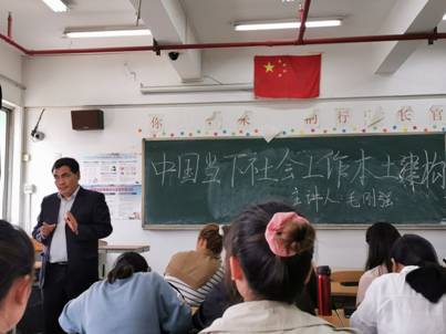 过程分为两个阶段,第一个阶段毛刚强老师首先介绍西方社会工作的起源,基于西方社会变迁、济贫法、工业化、流动化、城市化、现代化过程中社会问题的产生,为了解决社会失范、社会秩序等问题而产生了社会工作。然后分析了中国社会工作的源起与发展,他讲到中国社会工作产生是因为社会变迁,社会风险等问题需要有所回应,需要推进社会团结,社会合作。并剖析社会治理方式、社会运行模式、社区治理面临的挑战。