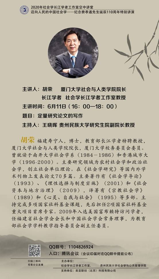 社会学与公共管理学院共同举办的“2020年社会学长江学者工作室空中讲堂迈向人民的中国社会学——纪念费孝通先生诞辰110周年特别讲演”活动的第十场讲座隆重开讲。主讲人为厦门大学社会与人类学院院长、长江学者胡荣教授,讲演题目为:《定量研究论文的写作》。此次讲堂共5个平台同步直播,4031人在线观看,27034次浏览。