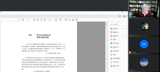 硕博研究生赋予了新的价值理论,构建了新的研究视域,在整个授课过程中与会同学们认真聆听并通过语音、聊天窗口与周晓虹教授进行了热烈的互动与探讨,同学们获益良多,并期待“社会学理论与经典文献选读”的下次精彩内容。同学们在与周晓虹教授的沟通和交流过程中,不仅在理论方面、研究方法上得到了很大收获,而且在理论视野和专业素养上也有很大提升。
