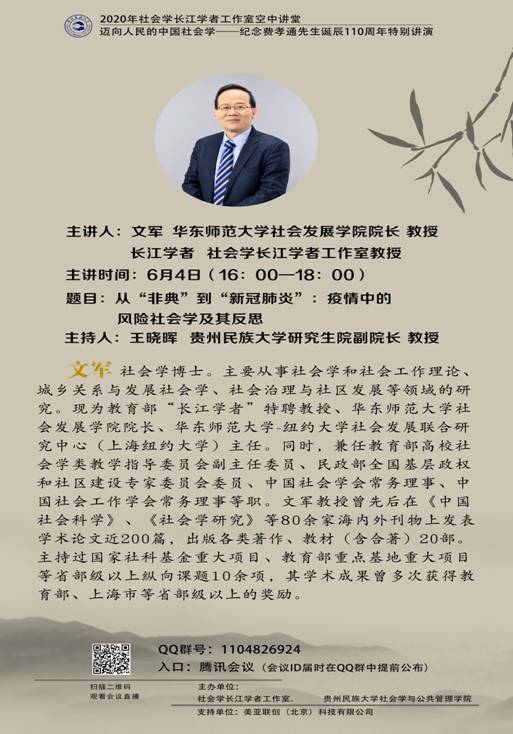 64日,由社会学长江学者工作室和探花直播 社会学与公共管理学院共同举办的“2020年社会学长江学者工作室空中讲堂迈向人民的中国社会学——纪念费孝通先生诞辰110周年特别讲演活动的第八场讲座隆重开讲。主讲人为华东师范大学社会发展学院院长、长江学者文军教授,讲演题目为:《从“非典”到“新冠肺炎”:疫情中的风险社会学及其反思》。此次讲堂共4个平台同步直播,4215人在线观看,25023次浏览。此外,学术杂志直播平台有1489人在线观看。
