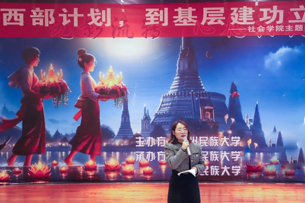 活动伊始,学院党委副书记裴凡苗发表讲话。她指出,西部计划是国家引导青年扎根基层、服务社会的重要战略,更是学院学子践行“助人自助、服务社会”专业使命的宝贵平台。为了让更多的大学生了解西部计划的政策背景、服务内容及社会意义,在校园内弘扬“到西部去,到基层去,到祖国最需要的地方去”的志愿精神特开展此次评比活动。通过比赛营造“以赛促学”的良好氛围,此次各团支部的集体创作与展示,能提升班级凝聚力与创新力。她强调今天的评比活动,不仅是一次成果展示,更是一堂生动的思政课、一次青春的宣言!同时,她还提出三点期望:第一,以专业之光,照亮西部需求。她鼓励同学们将专业理论知识,转化为西部大地上的解决方案,真正实现“用脚步丈量祖国,用专业回应时代”;第二,以青春之我,锤炼奋斗底色。她号召同学们以优秀志愿者为榜样,在艰苦环境中锤炼自我;第三,以学院为盾,共赴西部之约。她表示学院也将通过设立“西部计划专项导师库”、搭建“西行者校友网络”,为参与西部计划的学子提供支持。