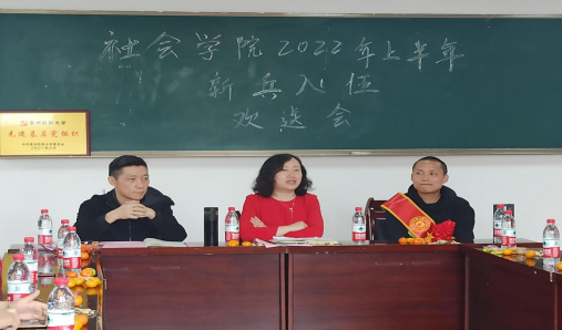 在3号楼201教室举行2022年春季新兵入伍欢送会。学院党委书记李黎、正处级组织员万秋月出席,各班主任、辅导员及部分在校学生参加了欢送会。会议由党委副书记高鸿纲主持。