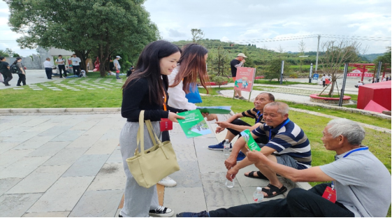 在参观完烈士陵园后,在基地核心成员康红梅教授的带领下,基地全体成员以小组形式向当地居民发放并讲解社科知识宣传小册,让当地居民更好地了解国家政策文件,了解社会治理、社会建设方面的知识,增进对基层政府部门和社会组织的理解。