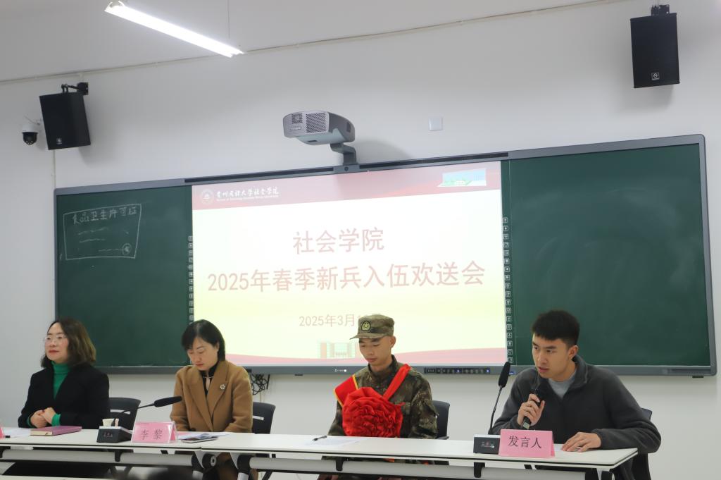 A206室举行了2025年春季新兵入伍欢送会。此次会议由学院党委副书记裴凡苗主持,学院党委书记李黎、院长包智明、副院长卫松、副院长王晓晖出席了会议。毕业班班主任老师及各年级学生代表参加了此次欢送会。