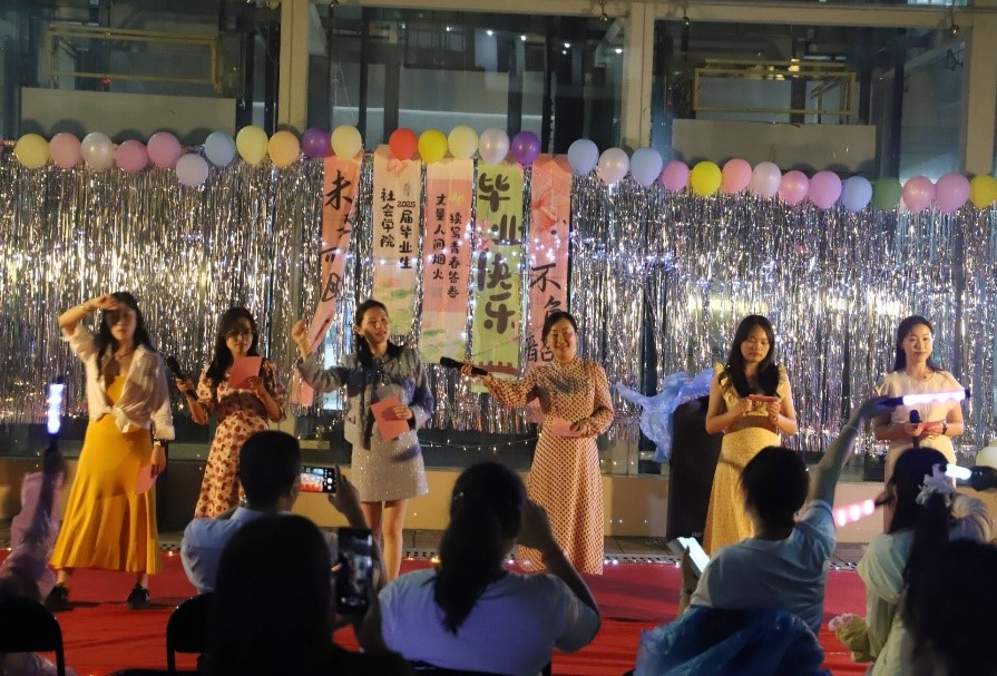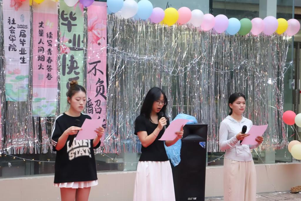 学生会呈现小品《体检预警》,在幽默中融入对健康的思考,引发观众共鸣;2024级社会工作专硕王诗琦演唱《喜欢你》,细腻声线诉说青春情愫。2024级社会学娄凌露的舞蹈《thirsty》,借独特编舞展现青春的探索与热忱;2022级社会学⑴班带来幕布剧《最好的我们》,以创意形式重现校园点滴,勾起师生回忆;2023级社会工作⑴班的走秀《服装大乱炖》,用奇思妙想诠释青春的多元与个性;2024级社会工作专硕⑴班演唱《一个人想着一个人》,在抒情旋律中抒发毕业季的不舍与牵挂。最后,毕业生代表欧阳仁独唱《匆匆那年》。