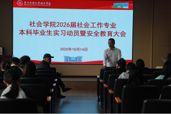 于2025年10月14日上午10点在学院A302教室召开2026届社会工作专业本科毕业生实习动员暨安全教育大会。学院党委副书记裴凡苗、副院长卫松教授、2026届社会工作班主任贺军老师及全体2026届社会工作专业本科毕业生参加本次会议。