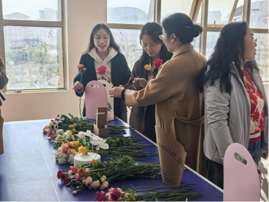 与此同时,A610活动室的插花活动也在有序推进。在专业花艺师的现场指导下,师生们分工协作、默契配合,开启创意创作之旅。大家首先根据个人审美偏好挑选花材,随后在花艺师的讲解中掌握花材修剪、固定造型、色彩搭配、层次布局等实操技巧。创作过程中,现场氛围轻松而热烈,作品风格多样纷呈。