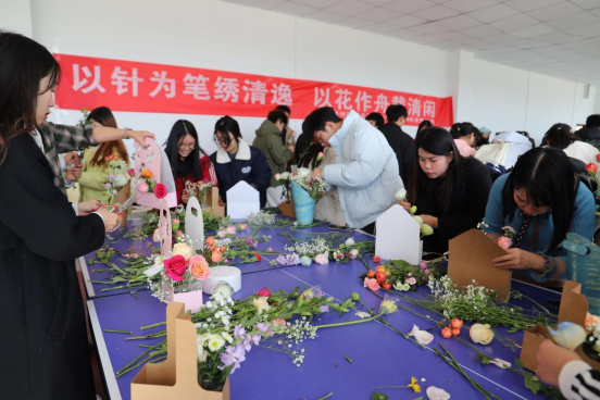 在A209、A610活动室面向全体师生举办“以针为笔绣清逸,以花作舟载闲情”主题美育活动。活动创新融合非遗刺绣与现代插花艺术,引导师生在针线穿梭与花枝剪裁的实践中体悟传统工艺的匠心之美,激发文化传承与创新活力。